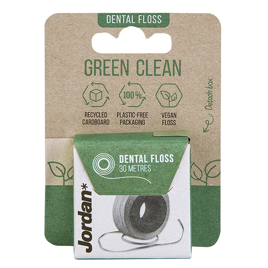 Jordan Green Clean tandtråd bruges til at rense mellem tænderne. Tandtrådsbeholderen er af 100% genanvendt pap og fungerer samtidig som yderemballage, hvilket mindsker emballagemængden. Det eneste plastik der er tilbage i produktet, er kernen, som tandtråden sidder på. Kernen er lavet af 100% genanvendt plastik. Selve tandtråden er vegansk.