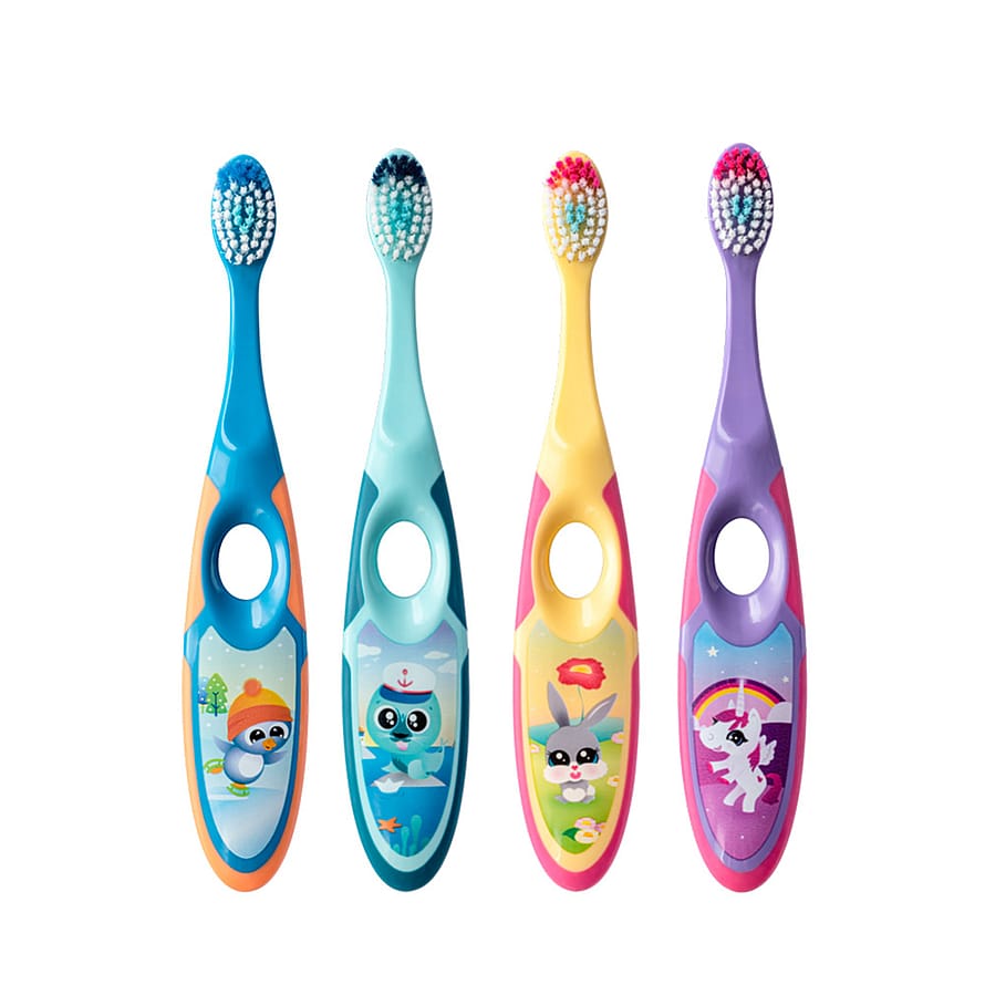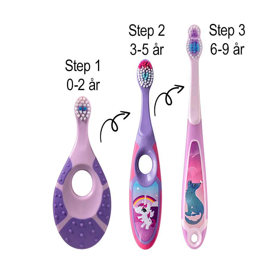 Skaft, hoved, børste og design er alle skræddersyede til at sikre, at du har de bedste vilkår til, at få indarbejdet gode plejende tandvaner fra allerførste tand. Vælg den, der passer bedst til dit barn.