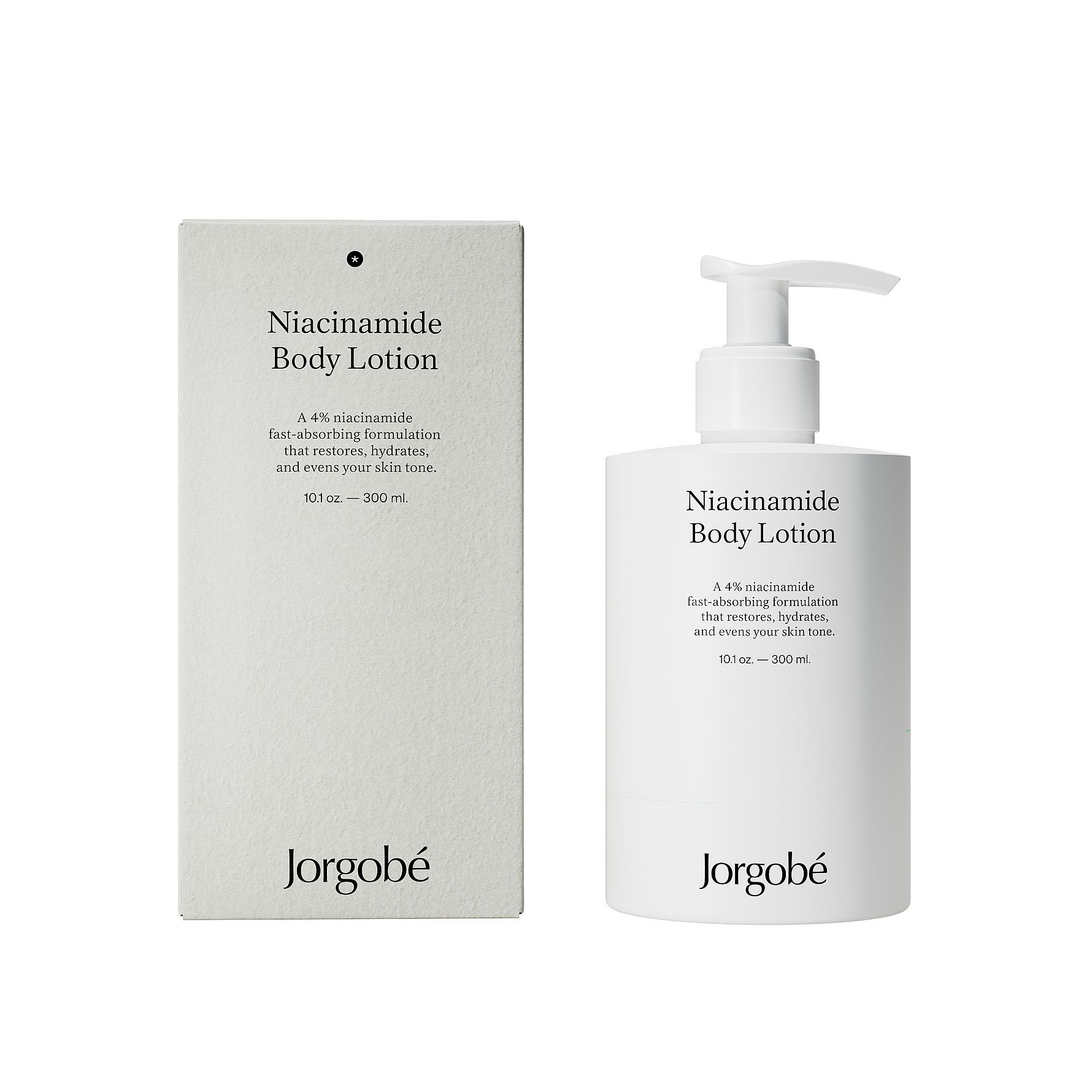 Genopbyg og beskyt din hud med Jorgobé Niacinamide Body Lotion – en hurtig absorberende, intensivt fugtgivende bodylotion med 4 % niacinamid, vitamin A, vitamin E og hyaluronsyre.