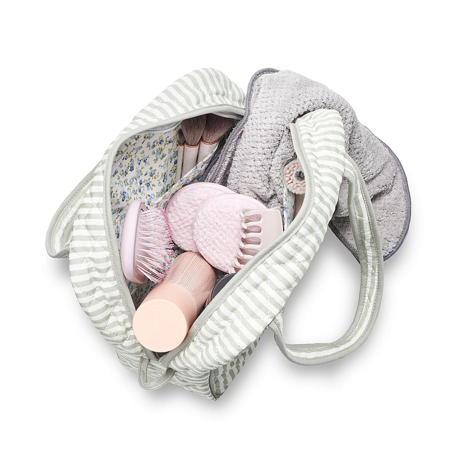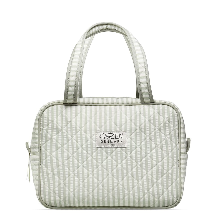 Toilettaske i blød grøn og hvid-stribet bomuld, er den perfekte kombination af elegance og funktionalitet.