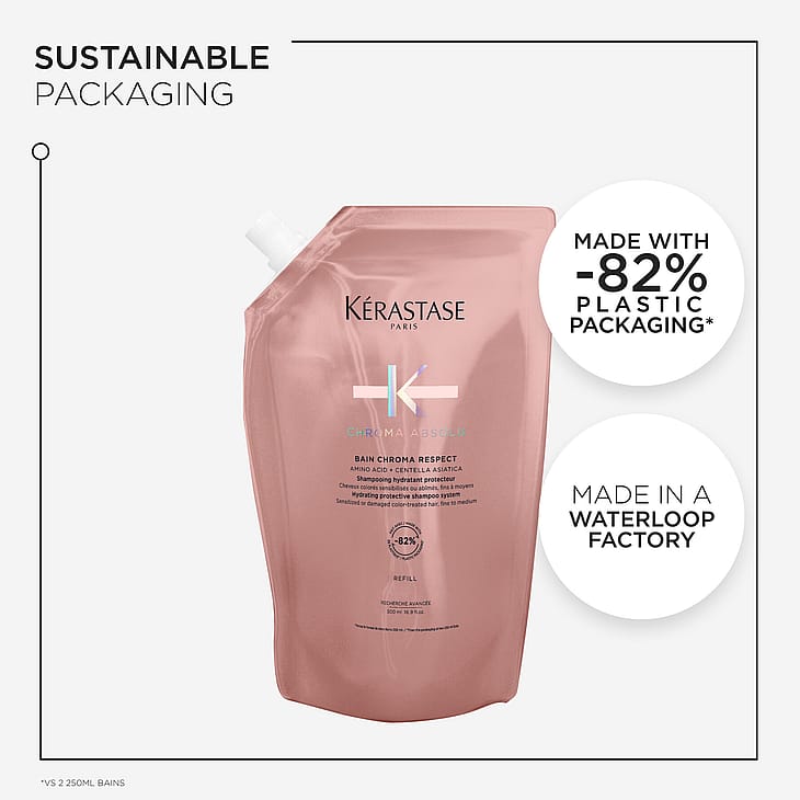 De innovative formler giver 96 % mere styrke*, reducerer krus pga. farve med 77 %** og giver 70 % mere glans***. Efter 6 uger er 92 % af farveintensiteten bevaret****. *Instrumental test: Soin Acide Chroma Gloss + Sérum Chroma Thermique **Instrumental test: Sérum Chroma Thermique ***Instrumental test: Soin Acide Chroma Gloss ****Instrumental test: Bain Chroma Respect + Fondant Cica Chroma eller Bain Riche Chroma Respect + Masque Chroma Filler eller Bain Riche Chroma Respect + Soin Acide Chroma Gloss. Refill-posen kan kun bruges sammen med vores 500 ml shampooflaske.