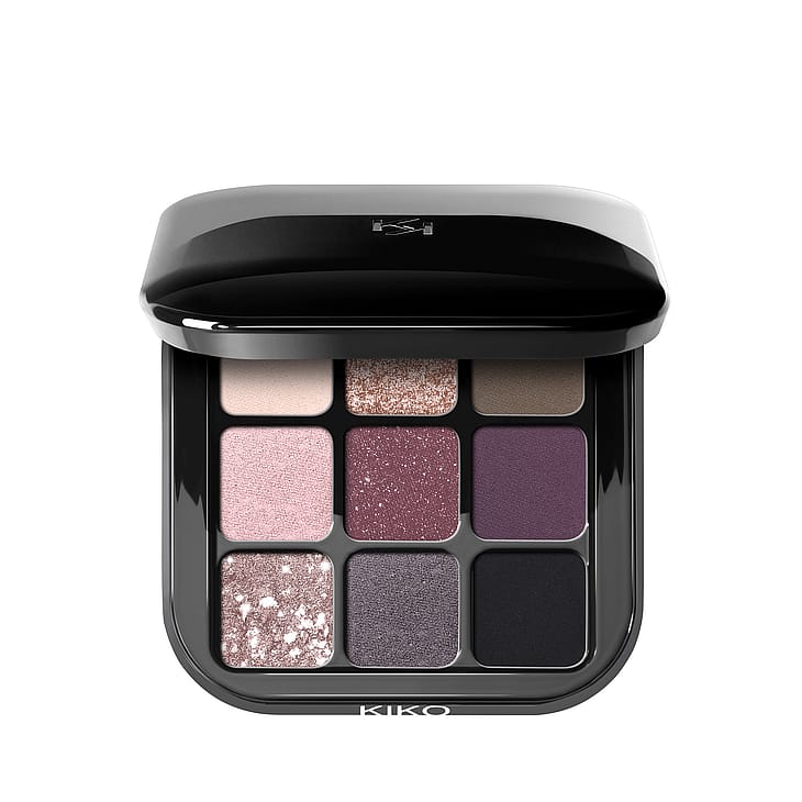 Palette med 9 multi-finish øjenskygger: matte, perlemorsmetallic, marmorerede og glitrende.