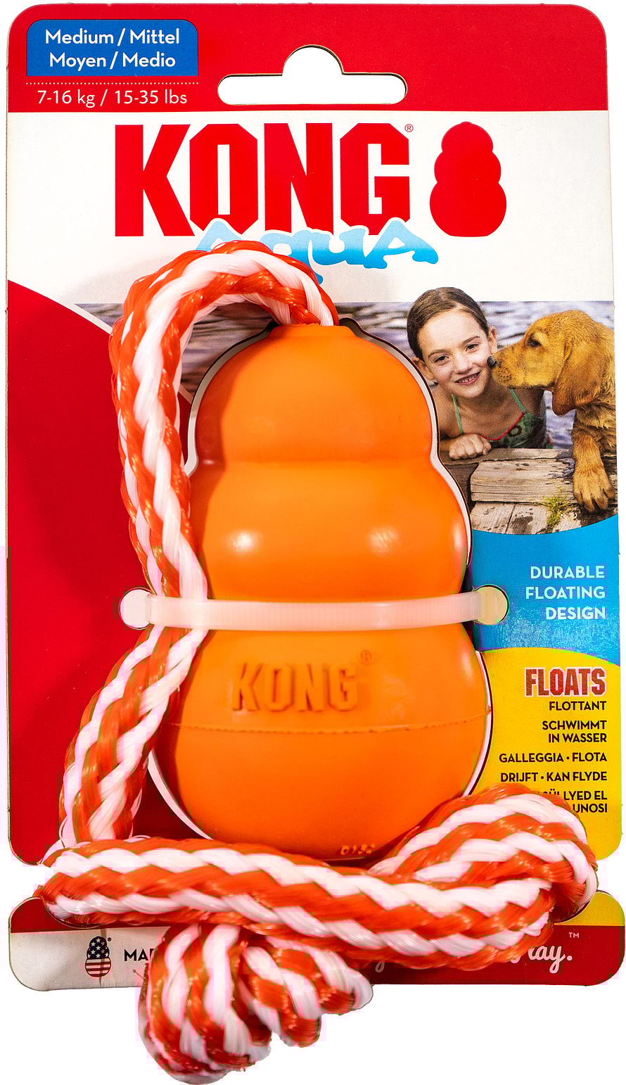 KONG Aqua er et flydende apporteringslegetøj, der fremmer sjov og motion både i og uden for vandet.