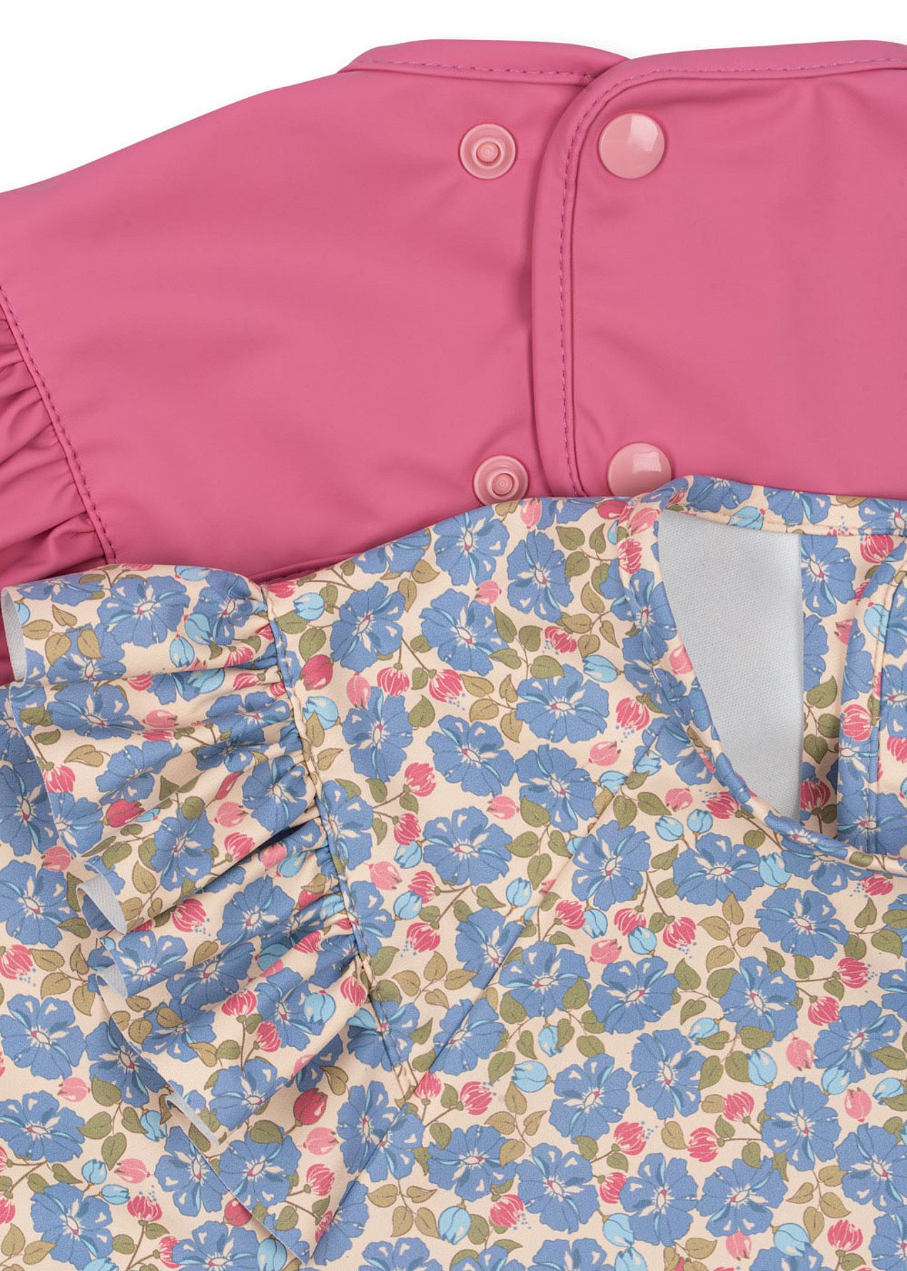 Søde og praktiske hagesmække, der er nemme at rengøre. Hagesmækken har ærmer, så barnets tøj er godt beskyttet. Dette produkt er certificeret i henhold til OEKO-TEX® STANDARD 100, klasse 1 af DTI Tekstil, DTI 2276-361.