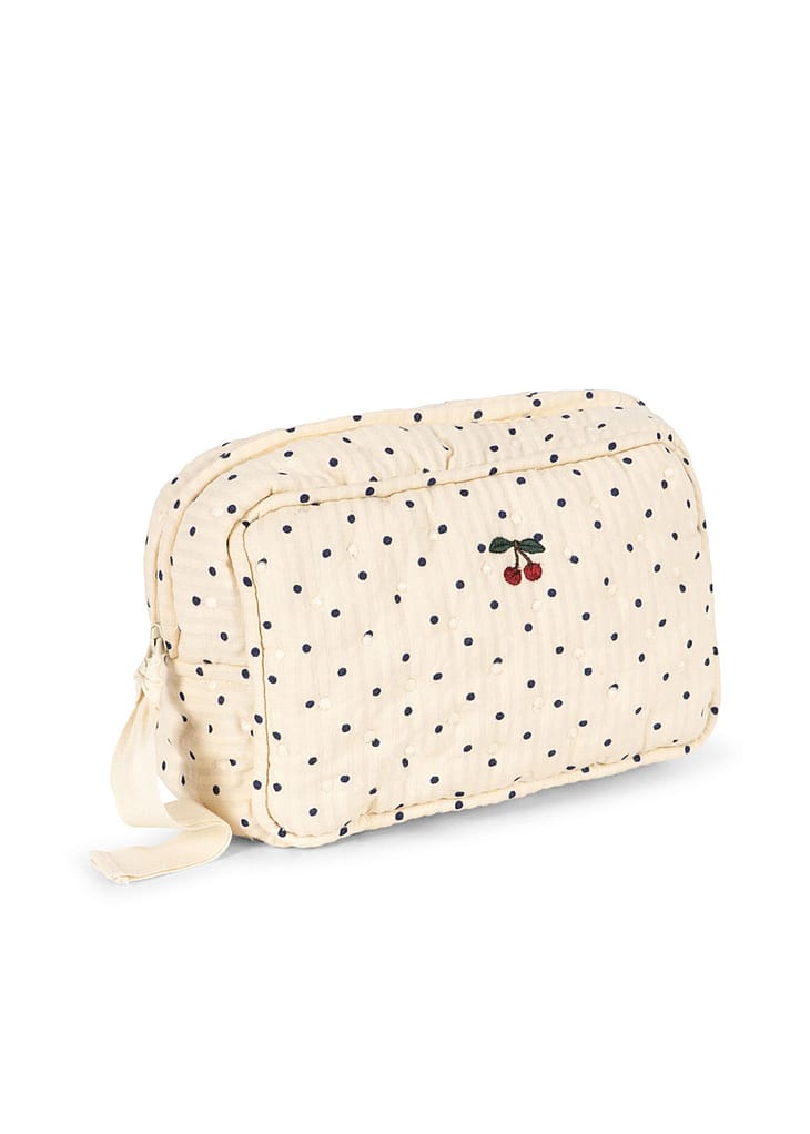 Lille quiltet toilettaske designet med ét stort rum og en mindre inderlomme til småting.