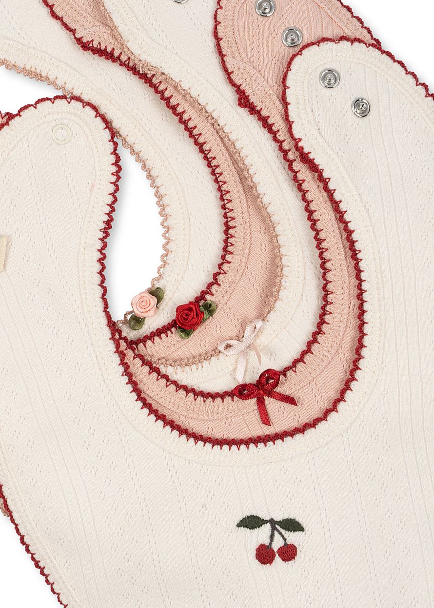 Pakke med praktiske hagesmække med dekorativt hulmønster.