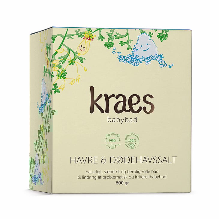 KRAES havre & dødehavssalt er et 100% naturligt & sæbefrit bad udviklet specifikt lindring af problematisk eller irriteret baby-/barnehud. Produktet har A-Kolbe hos TÆNK, er dermatologisk testet og kan desuden anvendes dagligt eller ugentligt efter behov.