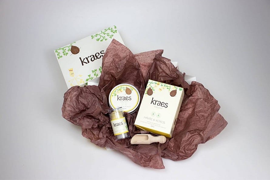 KRAES gaveæsken indeholder de 3 mest populære KRAES produkter, som alle er 100% naturlige, dermatologisk testede og har A-Kolbe i TÆNK Kemi: KRAES babybad med havre & kokos, KRAES glade kinder og KRAES baby balm – i én lækker gaveæske - perfekte til barsels-, fødselsdags- eller julegaven eller bare som en dejlig introduktion til KRAES.