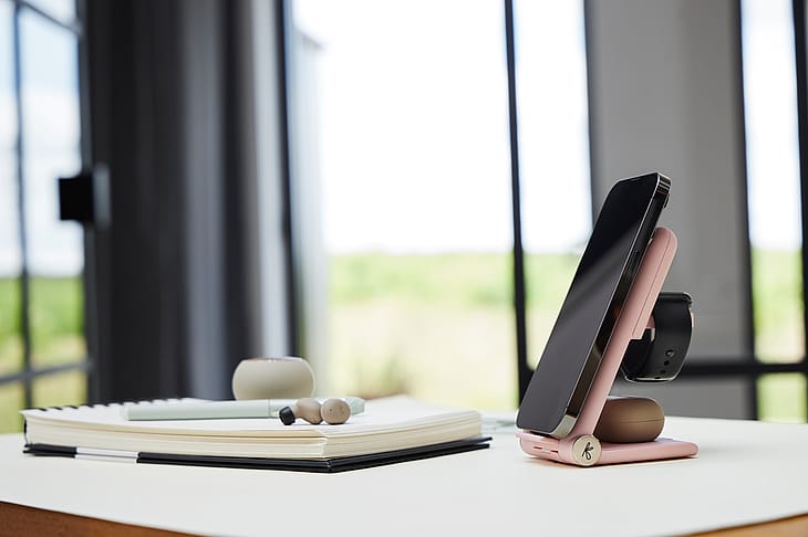 Den foldbare reCHARGE+ ladestander oplader nemt dine enheder med hurtig opladning på 15W på fronten samt to opladezoner bagtil. Du kan dermed oplade din smartphone, earbuds og Apple Watch på én og samme tid. Nemt!