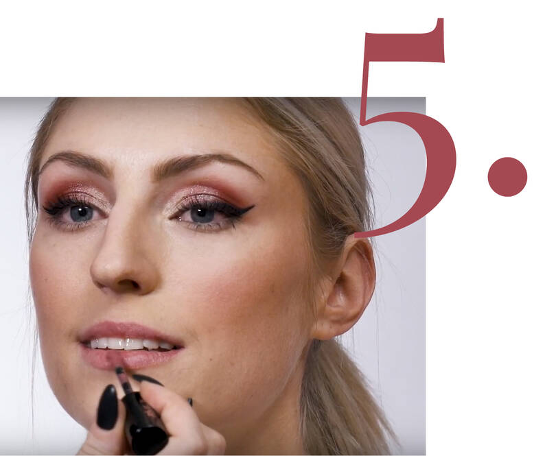 Line bruger nu Signature Brow Precision Pencil i farven Taupe til at definere brynene, og skabe naturlige buskede bryn. Derefter bruger hun KVD Vegan Beauty XO Vinyl Lip i farven Carnation.
