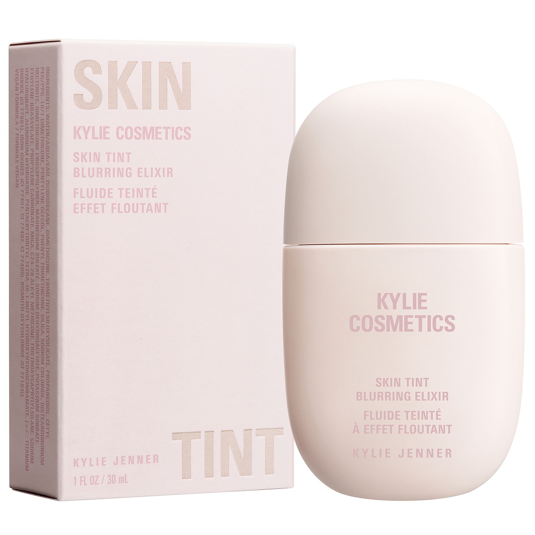 Skin Tint Blurring Elixir fra Kylie Cosmetics er en flydende tint-foundation med buildable dækning – fra let til medium – og en naturlig second-skin finish. Formlen er beriget med hyaluronsyre (natriumhyaluronat), som fugter huden og udjævner porer, fine linjer og hudtekstur. Den vægtløse tekstur holder i op til 12 timer uden at krakelere eller blive ujævn.