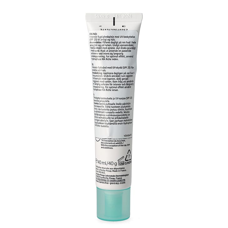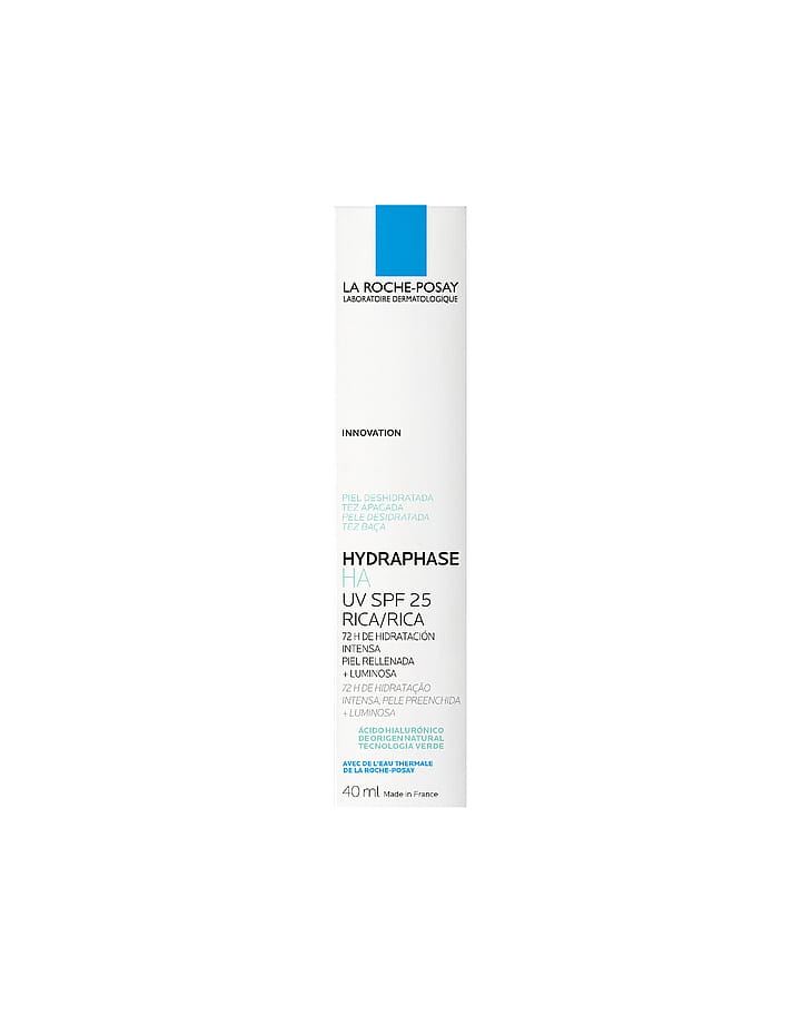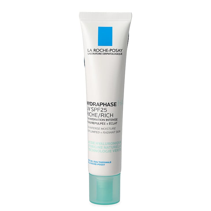 La Roche-Posay Hydraphase HA UV SPF 25 Riche: Intensiv fugtighedscreme med UV-beskyttelse (SPF 25) til ansigt og hals. Til tør og dehydreret hud. Giver 72 timers intens fugt til huden* og hjælper med at beskytte huden mod aldringstegn forårsaget af solens UV-stråler.