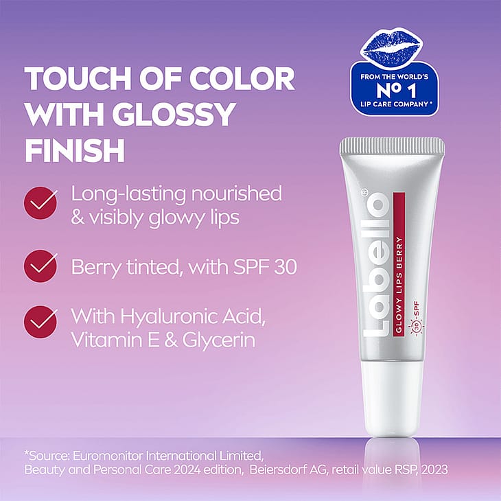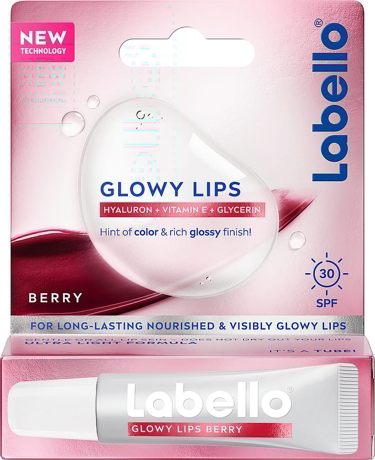 Labello® GLOWY LIPS med et strejf af farve og en fyldig glansfuld finish. For langvarige og synligt glødende læber.