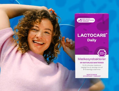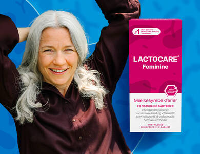 - Lactocare Feminine: En 3-i-1 formulering til kvinder med probiotiske stammer, tranebærekstrakt og vitamin B2.