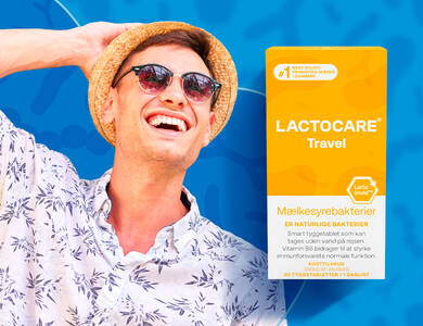 Lactocare Travel er udviklet til korttidsbrug før og under rejser. Produktet indeholder særligt robuste mælkesyrebakterier samt vitamin B2, som bidrager til immunsystemets normale funktion og til at mindske træthed og udmattelse.
