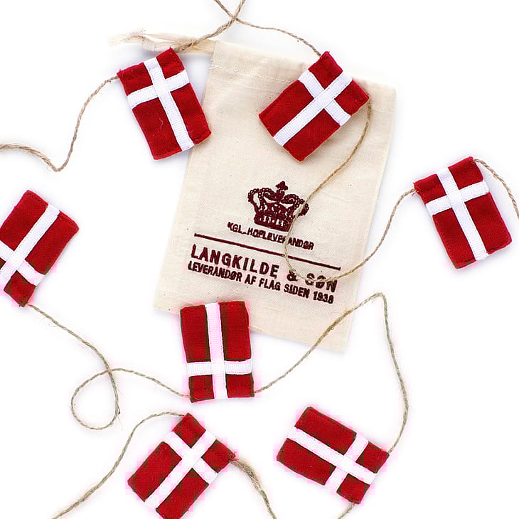 Flagranken med små Dannebrogsflag leveres i en smukt broderet stofpose til opbevaring.