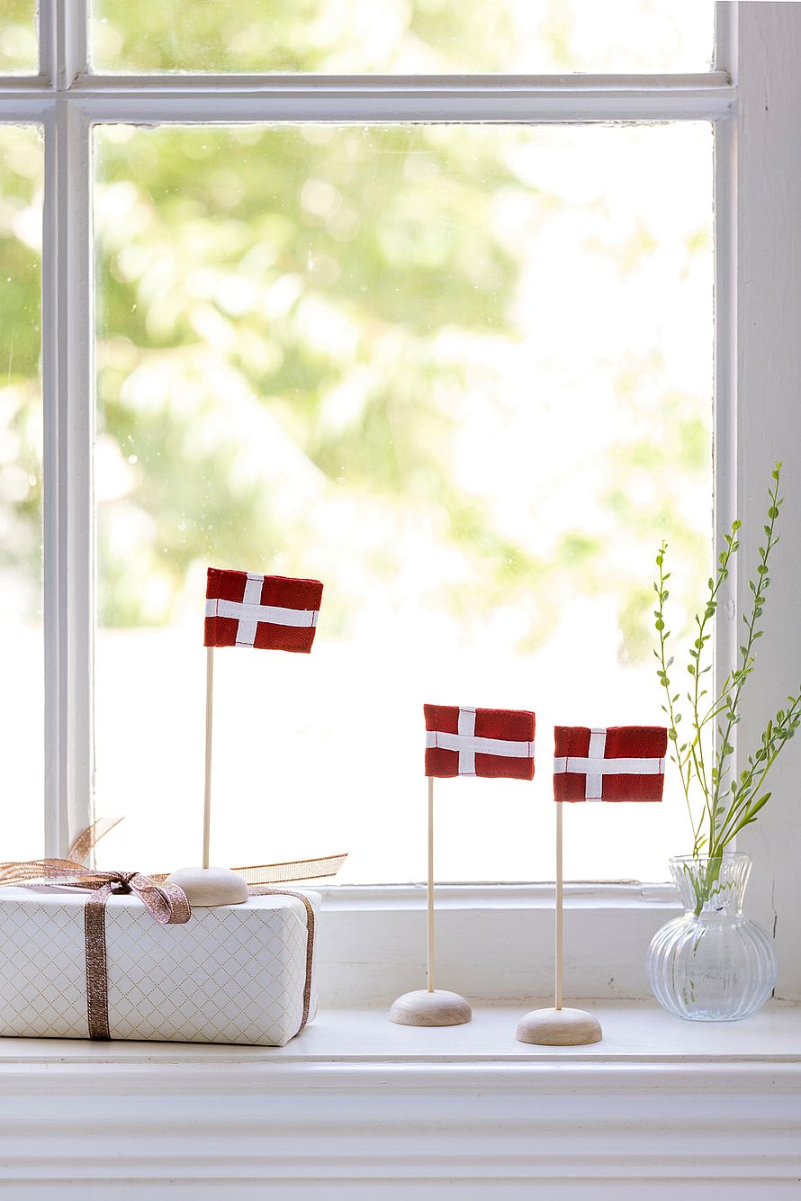 De små mini flagstænger står flot på ethvert festdækket bord eller i en vindueskarm og skaber en hyggelig, dansk atmosfære.