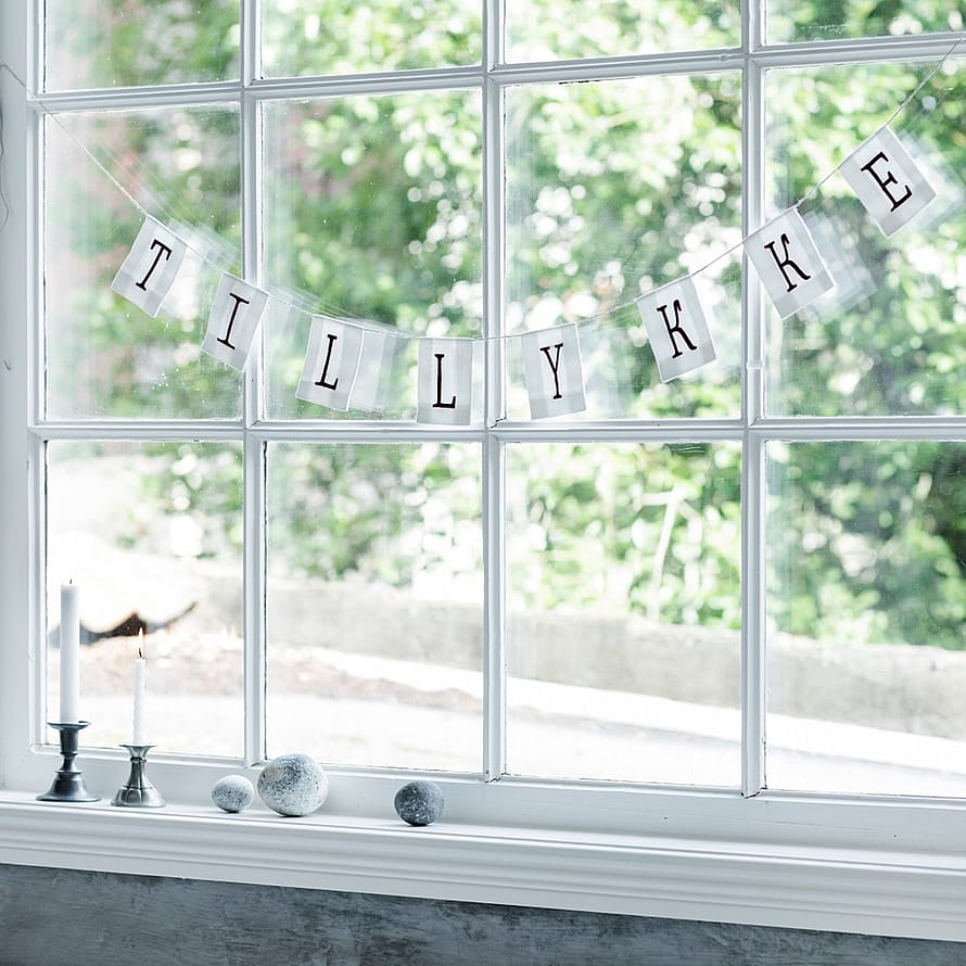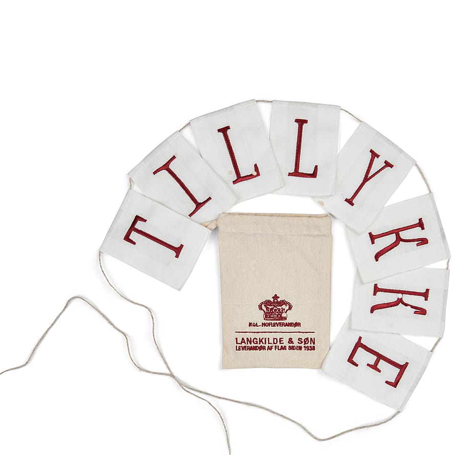 Meget smuk og elegant ranke med 8 hvide flag syet i vores originale flagdug, broderet med rød tråd og sat på sejlmagergarn lige til at hænge op og bruge år efter år. Brug flagranken til fødselsdage, bryllupsdage, konfirmationer og andre festlige lejligheder.