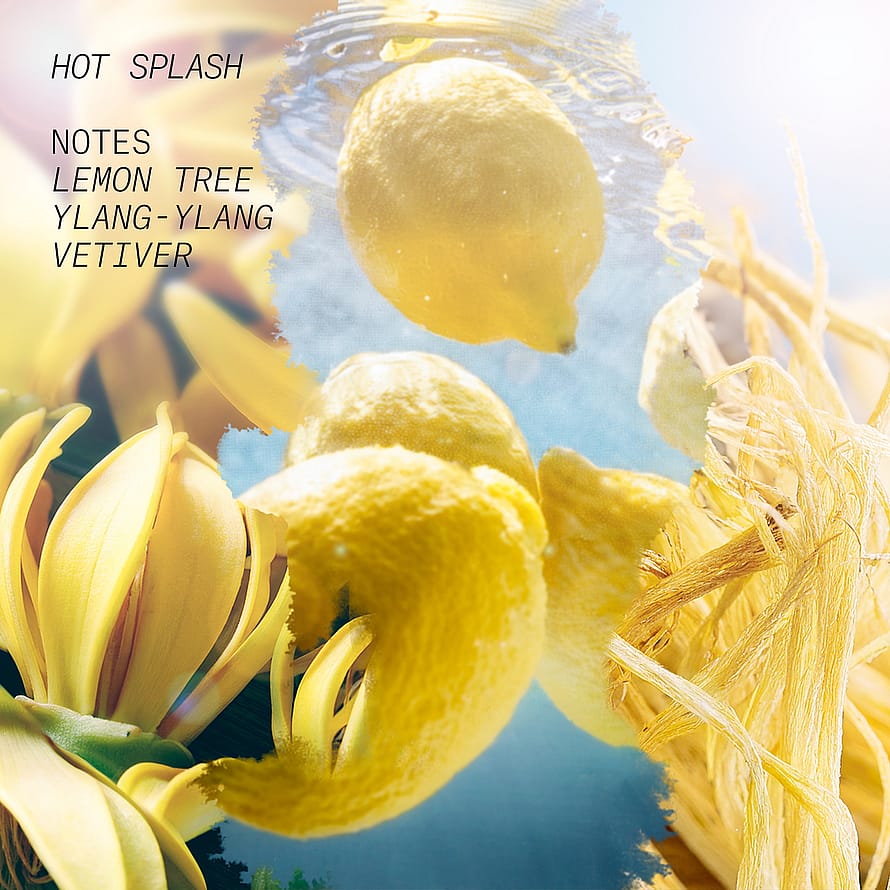 Hot Splash åbner med en livlig citrusintro, hvor sprød citron møder delikate florale accenter, og parfymens midterfase folder sig ud med ylang-ylang og blødere blomsternuancer. Basen består af mere jordnære trætoner, blandt andet vetiver, som giver dybde og balance uden at dominere. Kompositionen er velafstemt og designet til at fungere alene eller som et supplement i en personlig duftgarderobe.
