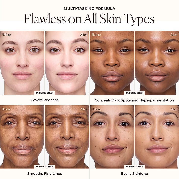 Den har en let tekstur, som glider over huden og giver en dugfrisk overflade uden at virke maskerende. Formuleringen indeholder præbiotiske komponenter og planteekstrakter, som tilsigter at støtte hudens barriere og fugtbalancen. Forbrugertest viser forbedret komfort og et mere ensartet udseende efter regelmæssig brug. Produktet er designet til både daglig brug og længerevarende holdbarhed i almindelige daglige situationer. Påfør med fingerspidser, pensel eller svamp og byg dækningen op, hvor det ønskes, for et ensartet og smeltende resultat, der sidder diskret hele dagen.