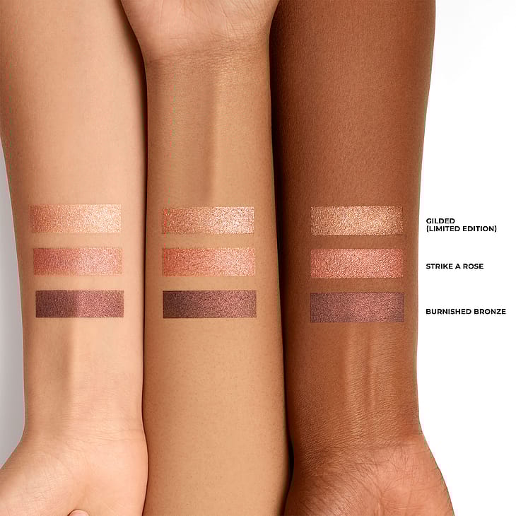 Burnished Bronze: DIMETHICONE, MICA, TRIMETHYLSILOXYSILICATE, SILICA, SYNTHETIC WAX, POLYETHYLENE, STEAROXYMETHICONE/DIMETHICONE COPOLYMER, STEARYL DIMETHICONE, CAPRYLYL METHICONE, CALCIUM SODIUM BOROSILICATE, OCTADECENE, COPERNICIA CERIFERA (CARNAUBA) WAX (COPERNICIA CERIFERA CERA/CIRE DE CARNAUBA), POLYSILICONE-11, DISTEARDIMONIUM HECTORITE, CAPRYLIC/CAPRIC TRIGLYCERIDE, PENTAERYTHRITYL TETRA-DI-T-BUTYL HYDROXYHYDROCINNAMATE, PROPYLENE CARBONATE, POLYHYDROXYSTEARIC ACID, BRASSICA CAMPESTRIS (RAPESEED) SEED OIL, RICINUS COMMUNIS (CASTOR) SEED OIL, SODIUM HYALURONATE, HYDROGENATED CASTOR OIL, POLYGONUM TINCTORIUM LEAF EXTRACT, DICALCIUM PHOSPHATE, RUBUS IDAEUS (RASPBERRY) LEAF EXTRACT, BHT. +/- (MAY CONTAIN/PEUT CONTENIR) TITANIUM DIOXIDE (CI 77891), IRON OXIDES (CI 77491, CI 77492, CI 77499), BLUE 1 LAKE (CI 42090), ALUMINUM POWDER (CI 77000).Strike A Rose: DIMETHICONE, MICA, TRIMETHYLSILOXYSILICATE, SILICA, SYNTHETIC WAX, POLYETHYLENE, STEAROXYMETHICONE/DIMETHICONE COPOLYMER, STEARYL DIMETHICONE, CAPRYLYL METHICONE, CALCIUM SODIUM BOROSILICATE, OCTADECENE, COPERNICIA CERIFERA (CARNAUBA) WAX (COPERNICIA CERIFERA CERA/CIRE DE CARNAUBA), POLYSILICONE-11, DISTEARDIMONIUM HECTORITE, CAPRYLIC/CAPRIC TRIGLYCERIDE, PENTAERYTHRITYL TETRA-DI-T-BUTYL HYDROXYHYDROCINNAMATE, PROPYLENE CARBONATE, POLYHYDROXYSTEARIC ACID, BRASSICA CAMPESTRIS (RAPESEED) SEED OIL, RICINUS COMMUNIS (CASTOR) SEED OIL, SODIUM HYALURONATE, HYDROGENATED CASTOR OIL, POLYGONUM TINCTORIUM LEAF EXTRACT, RUBUS IDAEUS (RASPBERRY) LEAF EXTRACT, BHT, DICALCIUM PHOSPHATE, TIN OXIDE. +/- (MAY CONTAIN/PEUT CONTENIR) TITANIUM DIOXIDE (CI 77891), IRON OXIDES (CI 77491, CI 77492, CI 77499), YELLOW 5 LAKE (CI 19140).Gilded: DIMETHICONE, MICA, TRIMETHYLSILOXYSILICATE, SILICA, SYNTHETIC WAX, POLYETHYLENE, CALCIUM ALUMINUM BOROSILICATE, STEAROXYMETHICONE/DIMETHICONE COPOLYMER, STEARYL DIMETHICONE, CAPRYLYL METHICONE, CALCIUM SODIUM BOROSILICATE, OCTADECENE, COPERNICIA CERIFERA (CARNAUBA) WAX (COPERNICIA CERIFERA CERA/CIRE DE CARNAUBA), DICALCIUM PHOSPHATE, POLYSILICONE-11, DISTEARDIMONIUM HECTORITE, CAPRYLIC/CAPRIC TRIGLYCERIDE, PENTAERYTHRITYL TETRA-DI-T-BUTYL HYDROXYHYDROCINNAMATE, PROPYLENE CARBONATE, POLYHYDROXYSTEARIC ACID, BRASSICA CAMPESTRIS (RAPESEED) SEED OIL, TIN OXIDE, RICINUS COMMUNIS (CASTOR) SEED OIL, SODIUM HYALURONATE, HYDROGENATED CASTOR OIL, POLYGONUM TINCTORIUM LEAF EXTRACT, RUBUS IDAEUS (RASPBERRY) LEAF EXTRACT, BHT. +/- (MAY CONTAIN/PEUT CONTENIR) TITANIUM DIOXIDE (CI 77891), IRON OXIDES (CI 77491, CI 77492, CI 77499).