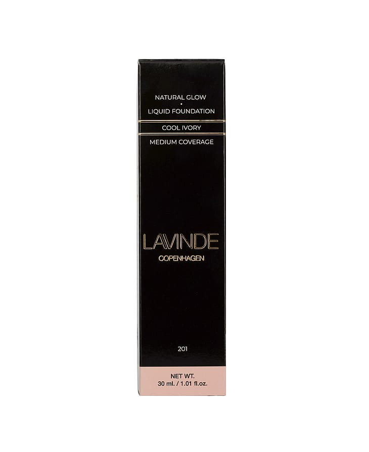 Den prisvindende Lavinde Copenhagen NATURAL GLOW Liquid Foundation, med medium dækkeevne, smelter ind i huden, fordi konsistensen er let som en fjer.