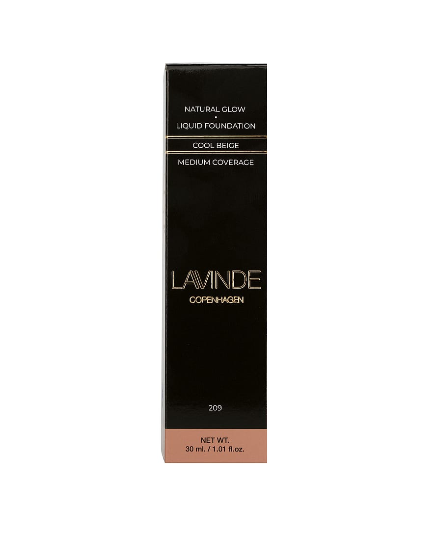 Den prisvindende Lavinde Copenhagen NATURAL GLOW Liquid Foundation, med medium dækkeevne, smelter ind i huden, fordi konsistensen er let som en fjer.