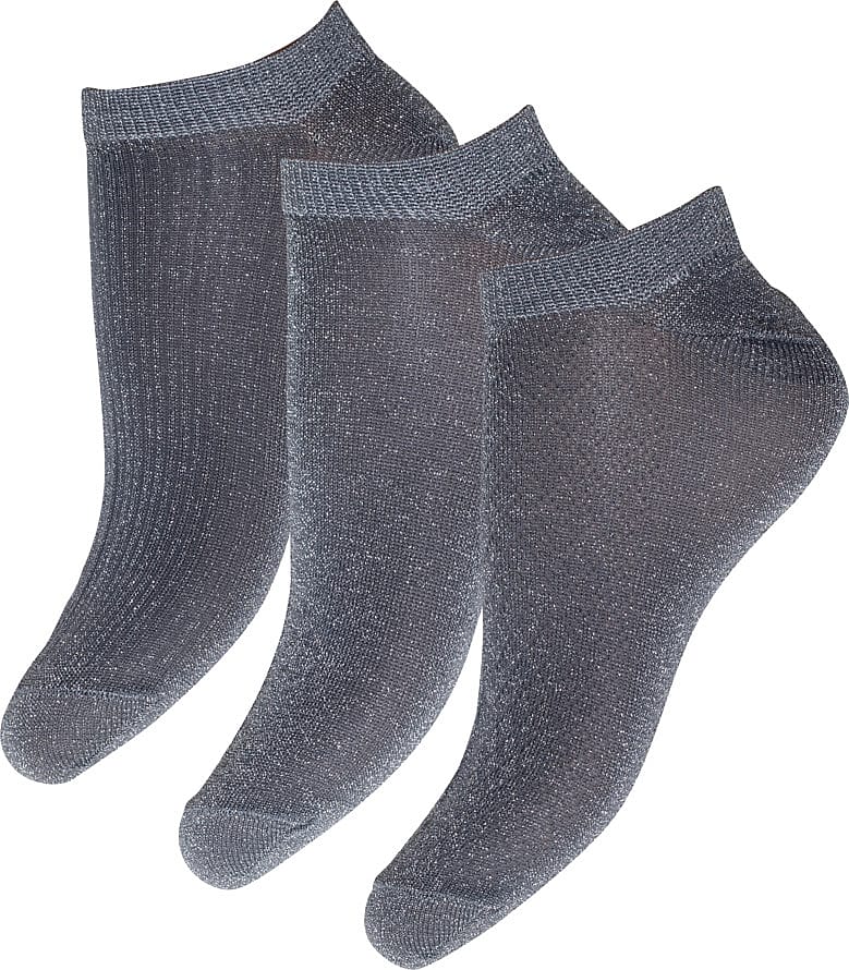 Feminine og tynde glimmer sneaker strømper, 3pak med forskellige strikmønstre. Moderigtig og til en god pris. Materiale: 78% Polyamid 10% Polyester 9% Lurex 3% Elastan