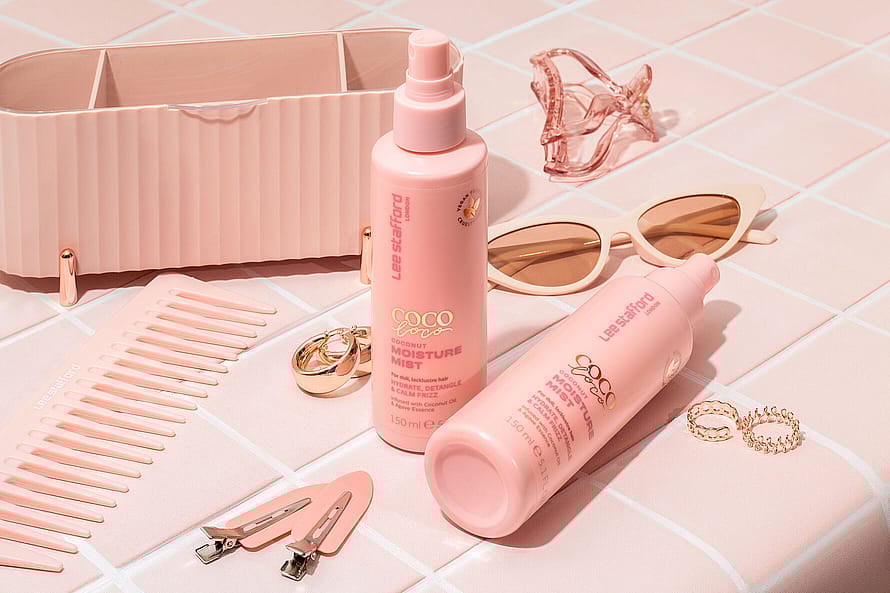 En fugtspray med kokos, der beroliger og udglatter tørt, filtret hår.