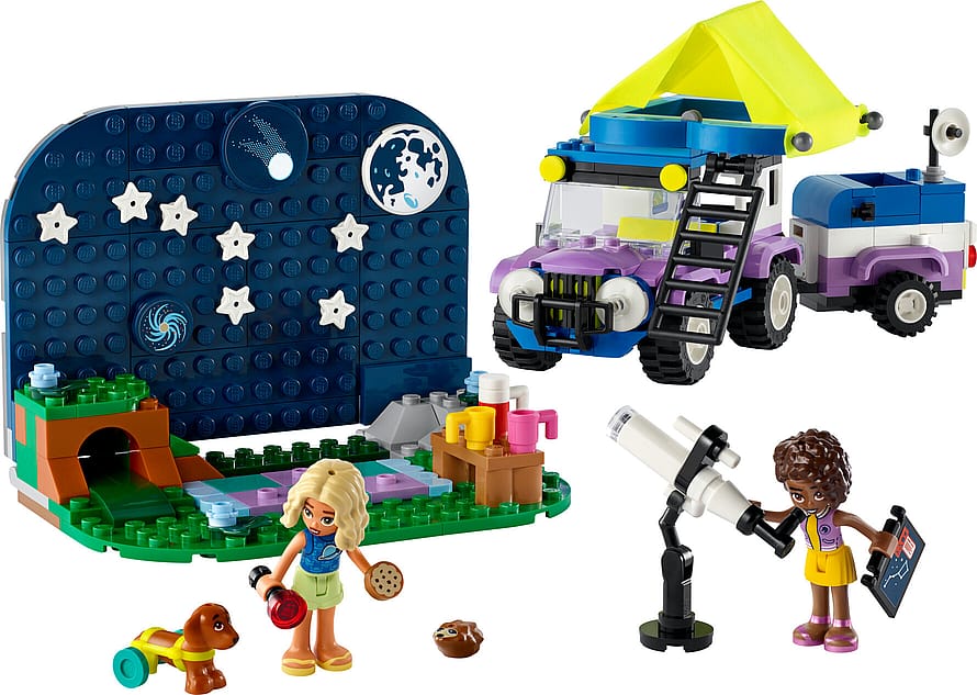 LEGO Friends legesættet Stjernekigger-campingvogn indeholder en firhjulstrækker, et legetøjsteleskop, tilbehør og 3 LEGO Friends figurer, der alle kan bygges.
