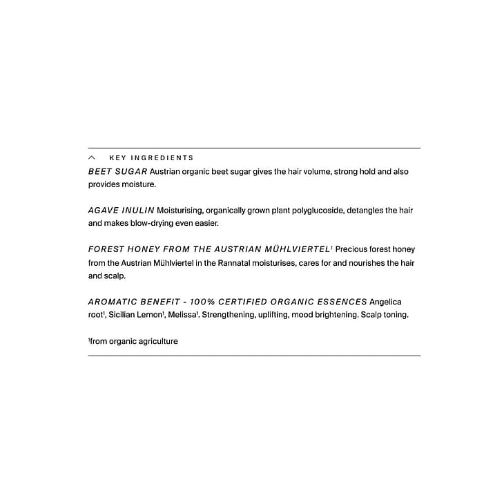 For maksimal volume føn dit hår med denne vægtløs volume spray. Økologisk sukkerroer giver volume, fugt og hold, mens honning nærer håret.
