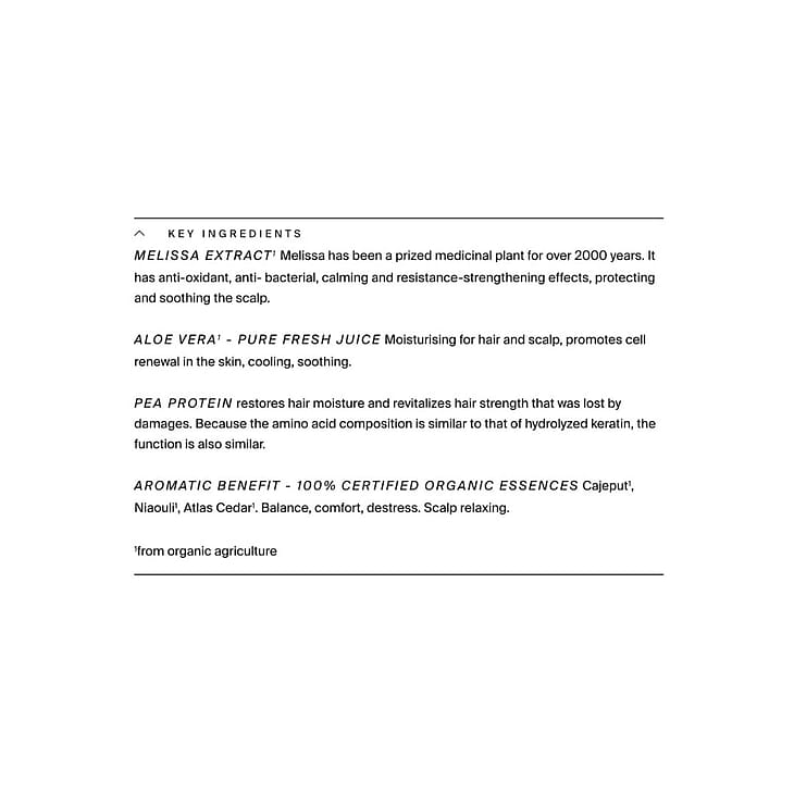Aqua, Aloe Barbadensis Leaf Juice1, Sodium Coco-Sulfate, Glycerin2, Cocoyl Methyl Glucamide, Decyl Glucoside, Melaleuca Leucadendron Cajaputi Oil1, Melaleuca Viridflora Leaf Oil1, Pelargonium Graveolens Oil1, Cedrus Atlantica Bark Oil1, Melissa Officinalis Leaf Extract1, Parfum1 (100% organic essential oils incl. Citronellol, Geraniol, Limonene, Linalool), Hydrolyzed Pea Protein, Coco-Caprylate/Caprate, Hydrogenated Olive Oil Unsaponifiables, Arginine, Coco-Glucoside, Glyceryl Oleate, Citric Acid, Sodium Chloride, Sodium Levulinate, Sodium Anisate, Sorbic Acid. 1from organic agriculture 2made using organic ingredients