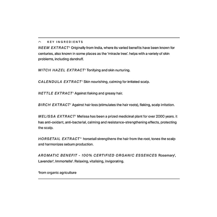 Aqua, Alcohol2, Rosmarinus Officinalis Water1, Lavandula Angustfolia Flower Water1, Helichrysum Italicum (Immortelle) Flower Water1, Glycerin2, Lavandula Angustfolia Oil1, Rosmarinus Officinalis Leaf Oil1, Azadirachta Indica Leaf Extract1, Urtica Dioica Leaf Extract1, Equisetum Arvense Extract1, Melissa Officinalis Leaf Extract1, Betula Alba Leaf Extract1, Hamamelis Virginiana Leaf Extract1, Calendula Officinalis Flower Extract1, Parfum1 (100% organic essential oils incl. Geraniol, Limonene, Linalool), Levulinic Acid. 1from organic agriculture 2made using organic ingredients