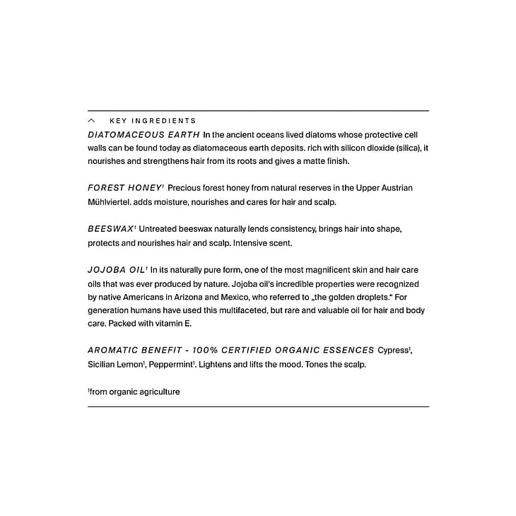 Cera Alba1, Simmondsia Chinensis Seed Oil1, Diatomaceous Earth, Sucrose Cocoate, Mel1, Aqua, Citrus Limonum (Lemon) Peel Oil Expressed1, Tocopherol, Cupressus Sempervirens Oil1, Mentha Piperita Oil1, Parfum1 (100% organic essential oils incl. Citral, Citronellol, Geraniol, Limonene, Linalool), Titanium Dioxide. 1from organic agriculture