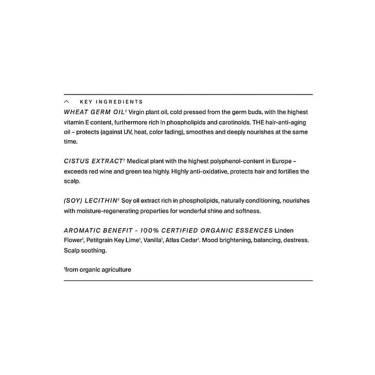 Aqua, Aloe Barbadensis Leaf Juice1, Cetearyl Alcohol, Glycerin2, Distearoylethyl Dimonium Chloride, Inulin1, Tilia Cordata Flower Extract1, Citrus Aurantifolia Leaf Oil1, Citrus Limonum Peel Oil Expressed1, Vanilla Planifolia Fruit Extract1, Parfum1 (100% organic essential oils incl. Benzyl Benzoate, Citral, Citronellol, Geraniol, Limonene, Linalool), Jojoba Esters, Cocos Nucifera Oil1, 3, Triticum Vulgare Germ Oil1, Cistus Incanus Flower/Leaf/Stem Extract1, Hydrolyzed Pea Protein, Hydrolyzed Wheat Protein, Helianthus Annuus Seed Wax, Coco- Caprylate/Caprate, Polyglycerin-3, Hydrogenated Olive Oil Unsaponifiables, Guar Hydroxypropyltrimonium Chloride, Glyceryl Oleate, Coco-Glucoside, Sodium Levulinate, Lactic Acid, p-Anisic Acid, Sodium Anisate, Tocopherol, Helianthus Annuus Seed Oil, Arginine, Citric Acid, Sodium Benzoate. 1from organic agriculture 2made using organic ingredients