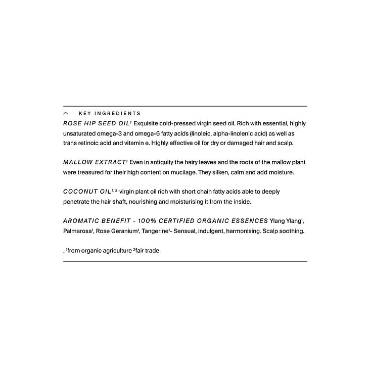 Eksklusiv økologisk certificeret shampoo er ideel til tykt, tørt og ødelagt hår. Indeholder bl.a. økologisk hybenkerneolie, mallow blomst og kokosolie, som plejer og genopbygger hårstråene igen.
