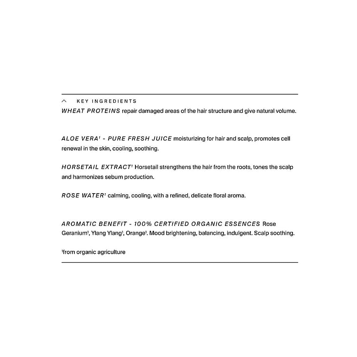Aqua, Aloe Barbadensis Leaf Juice1, Alcohol2, Citrus Aurantium Amara Flower Water1, Rosa Damascena Flower Water1, Hydrolyzed Wheat Protein, Equisetum Arvense Extract1, Citrus Aurantium Dulcis Peel Oil Expressed1, Pullulan, Pelargonium Graveolens Oil1, Parfum1 (100% organic essential oils incl. Benzyl Benzoate, Benzyl Salicylate, Citronellol, Farnesol, Geraniol, Limonene, Linalool), Arginine, Coco-Glucoside, Glycerin2, Glyceryl Oleate, Lactic Acid, Levulinic Acid. 1from organic agriculture 2made using organic ingredients
