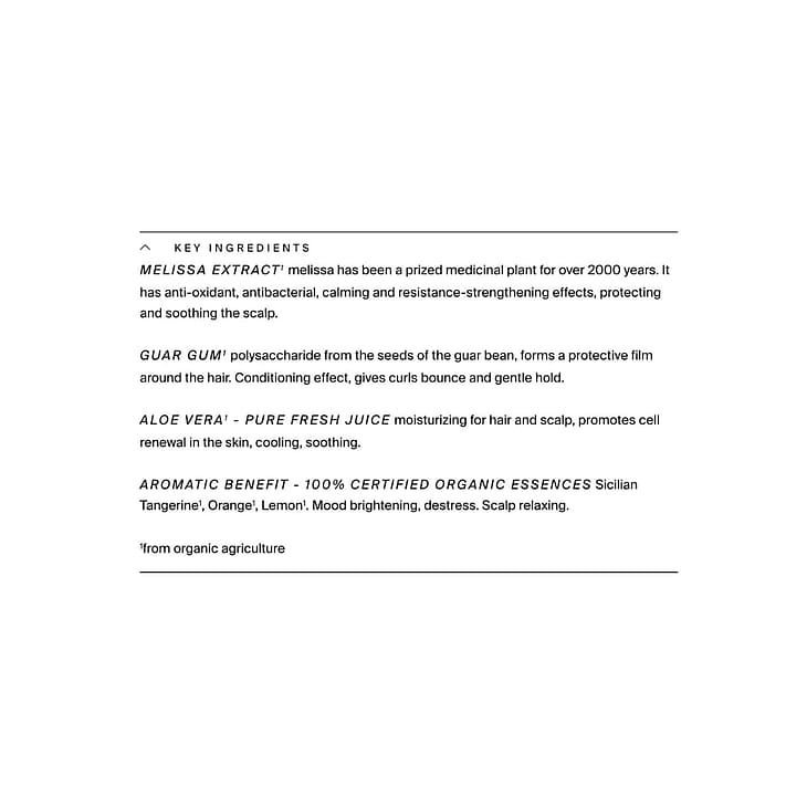Aqua, Aloe Barbadensis Leaf Juice1, Glycerin2, Guar Hydroxypropyltrimonium Chloride, Melissa Officinalis Leaf Extract1, Cyamopsis Tetragonoloba Gum1, Citrus Nobilis Peel Oil Expressed1, Citrus Aurantium Dulcis Peel Oil Expressed1, Citrus Limonum Peel Oil Expressed1, Parfum1 (100% organic essential oils incl. Benzyl Benzoate, Citral, Citronellol, Farnesol, Geraniol, Limonene, Linalool), Alcohol2, Arginine, Pullulan, Xanthan Gum, Microcrystalline Cellulose, Glyceryl Caprylate, Hydrolyzed Wheat Protein, Lactic Acid, Sodium Levulinate, Sodium Anisate, Tocopherol. 1from organic agriculture 2made using organic ingredients