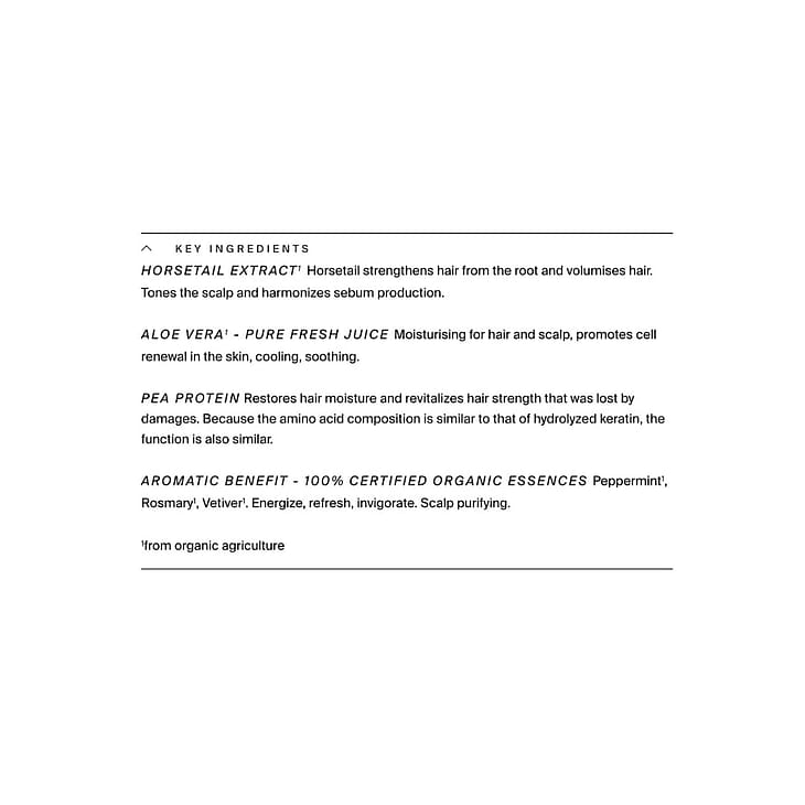 Aqua, Aloe Barbadensis Leaf Juice1, Sodium Coco-Sulfate, Glycerin2, Cocoyl Methyl Glucamide, Decyl Glucoside, Mentha Piperita Oil1, Rosmarinus Officinalis Leaf Oil1, Cedrus Atlantica Bark Oil1, Vetiveria Zizanoides Root Oil1, Equisetum Arvense Extract1, Parfum1 (100% organic essential oils incl. Citronellol, Geraniol, Limonene, Linalool), Hydrolyzed Pea Protein, Coco-Caprylate/Caprate, Hydrogenated Olive Oil Unsaponifiables, Arginine, Coco-Glucoside, Glyceryl Oleate, Citric Acid, Sodium Chloride, Sodium Levulinate, Sodium Anisate, Sorbic Acid. 1from organic agriculture 2made using organic ingredients