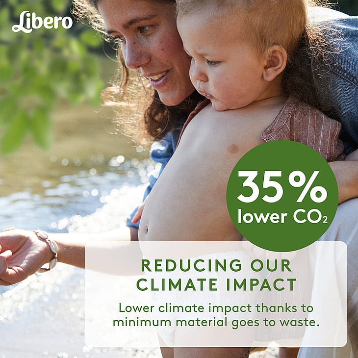har en 35 % lavere klimapåvirkning end en almindelig Libero ble, da der bl.a. genereres mindre affald. Hybridbleen er skånsom mod huden, takket være de superbløde og åndbare materialer.