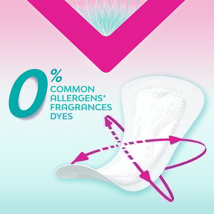 Som en del af vores V-Care™-serie har trusseindlægget en ekstra skånsom overflade, som hjælper med at forhindre kløe eller irritation. Og fordi det ikke indeholder de mest almindelige allergener, dufte eller farvestoffer, irriterer det ikke din mest sensitive, intime hud.