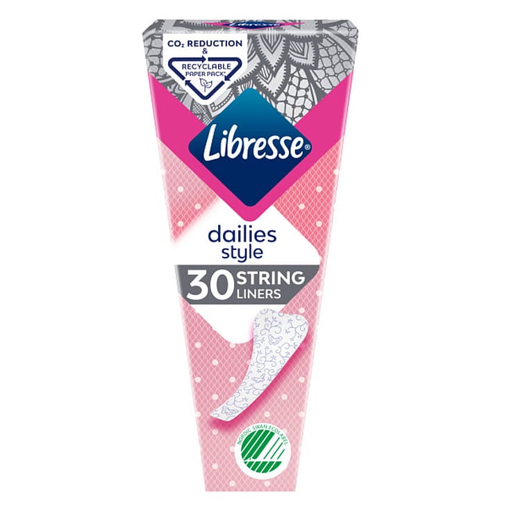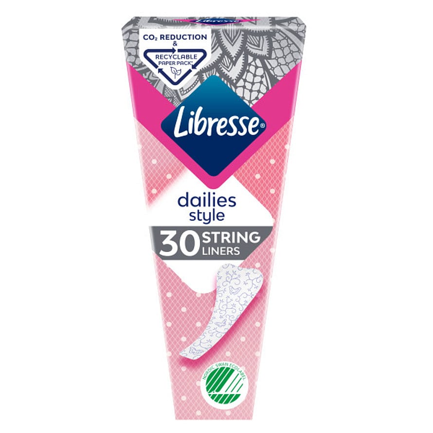 Libresse trusseindlæg String er udformet til diskret at følge trussekanten på dine stringtrusser. Udover den slanke form er det udført i et blødt og behageligt materiale, der tillader din hud at ånde naturligt.