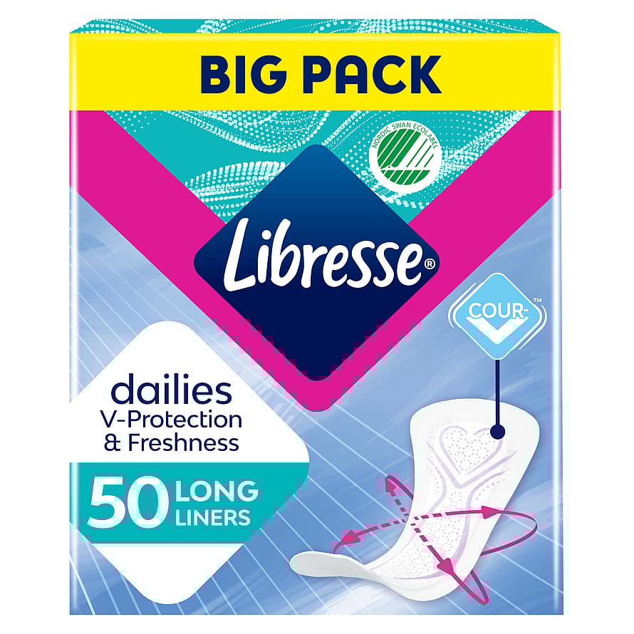Prøv de absorberende trusseindlæg Libresse Long, som er lidt længere for øget sikkerhed og beskyttelse. Trusseindlægget med Curvefit™ er specielt designet til at følge din krop og forblive på plads, uanset hvad du laver. Perfekt til daglig brug, så du altid kan føle dig tør og frisk.