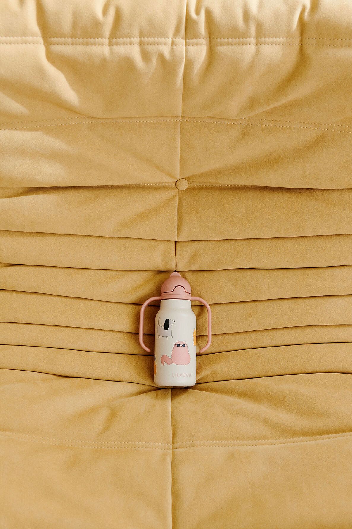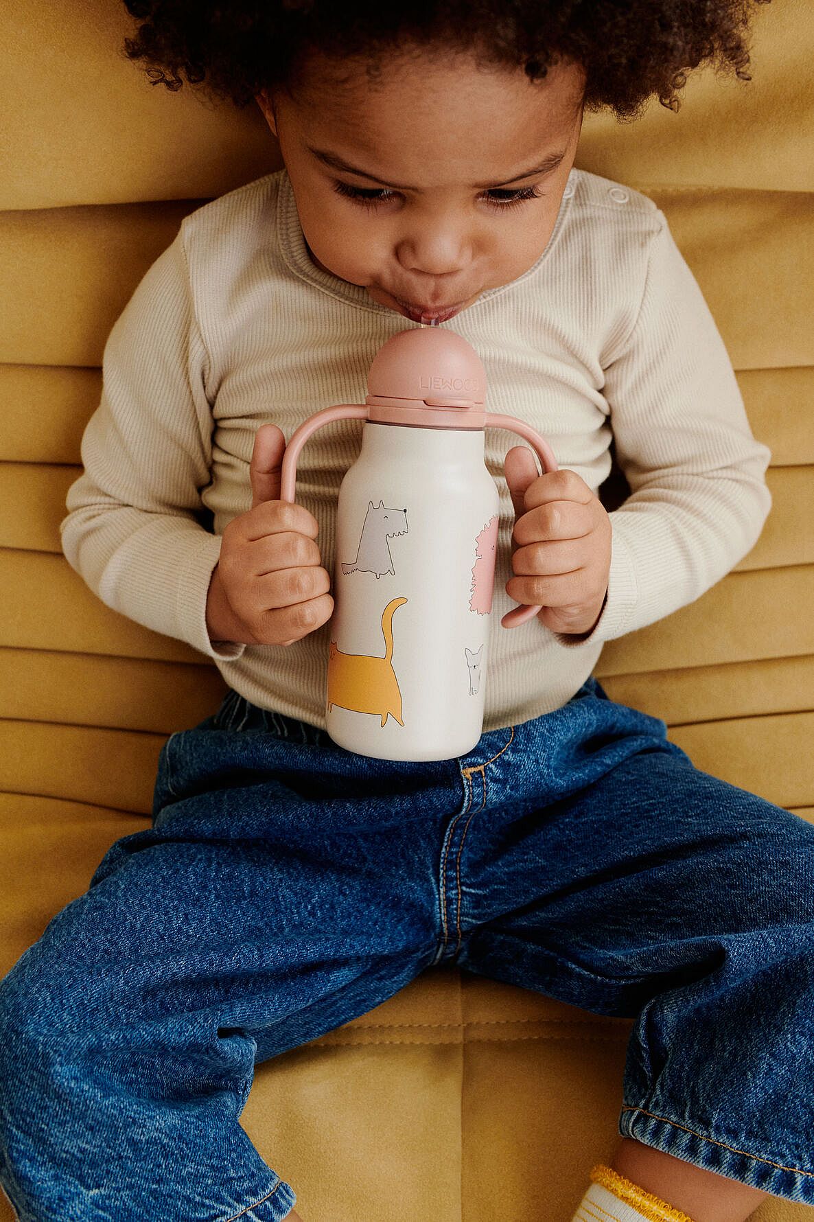 KIMMIE vandflasken er en innovativ drikkeflaske designet til tumlinge. De to håndtag fastgjort til låget og det indbyggede sugerør gør den nem at bruge selv for de mindste, når de skal lære at tippe flasken og drikke vand selv.