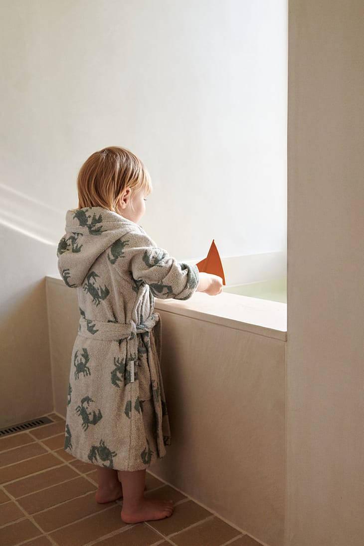 Der er ikke noget bedre end at blive svøbt i noget varmt og blødt efter et beroligende bad eller en sjov svømmetur. Lilana badekåben er lavet af tyk, økologisk frottébomuld, som holder dine små varme og tørre, imens bæltet og trykknapperne sørger for at badekåben bliver siddende, hvor den skal.