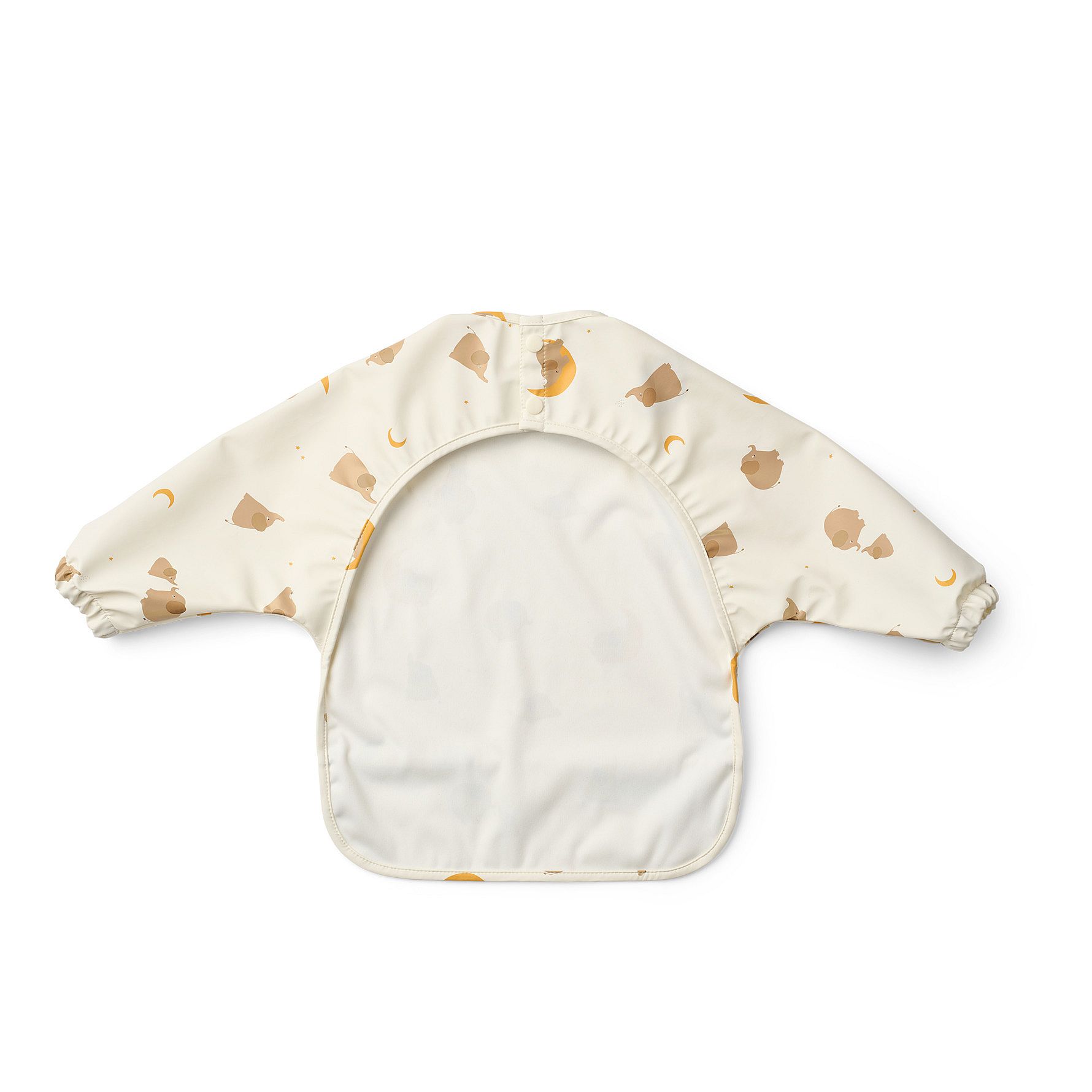 Hagesmæk med lange ærmer i et let materiale til børn, der er ved at lære at spise selv. Elastikkerne ved håndleddene og den vandafvisende overflade sikrer, at dit barns tøj forbliver rent. MERLE er fremstillet i slidstærkt, genanvendt polyester og kan nemt tørres af og foldes sammen.