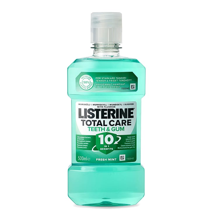 LISTERINE® Total Care Teeth & Gum med 10 fordele i 1 flaske. En del af Total Care porteføljen med komplet mundskyl fra LISTERINE®. Mundskyl, der holder tandkødet frisk og styrker tænderne. Giver en ren følelse, der varer 3 gange længere i forhold til kun tandbørstning. Modvirker dårlige ånde i op til 12 timer. Indeholder fluor, der beskytter mod huller i tænderne. Brug to gange dagligt efter tandbørstning. Fra 12 år.