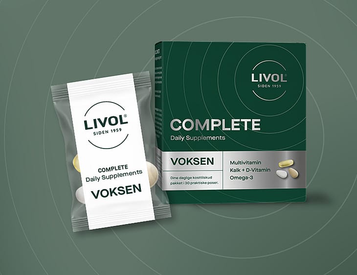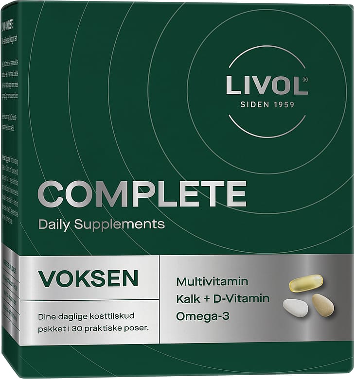 Med Livol Complete Voksen får du alt samlet i én praktisk dagspose – vitaminer, mineraler og omega-3.