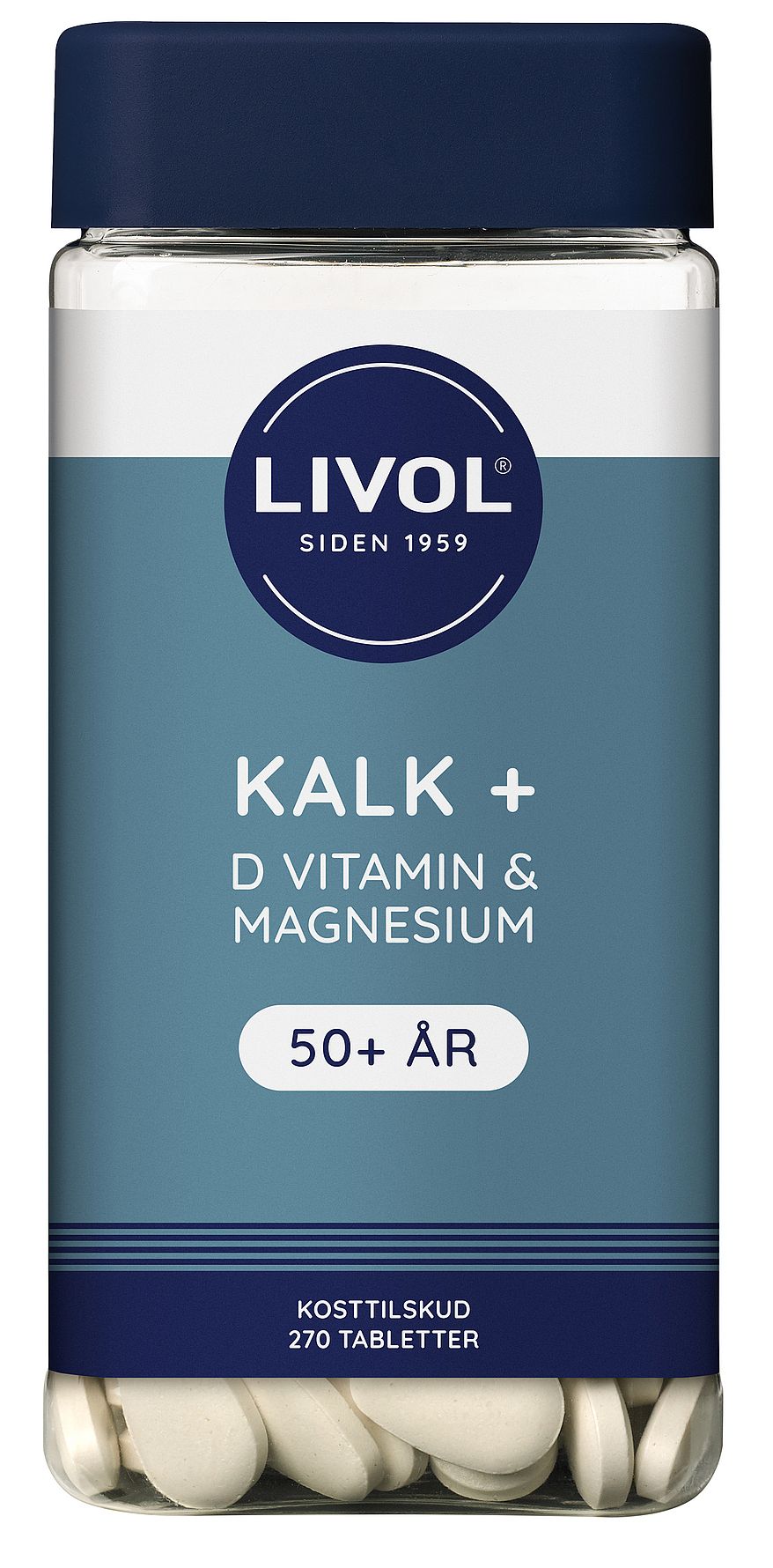 Livol Kalk 50+ er et kosttilskud med kalk, D-vitamin og magnesium. Produktet er målrettet voksne over 50 år, der ønsker at supplere med kalk, D-vitamin og magnesium udover kosten. Kalk er nødvendigt for at bevare normale knogler og tænder. Kalk bidrager også til musklernes normale funktion.