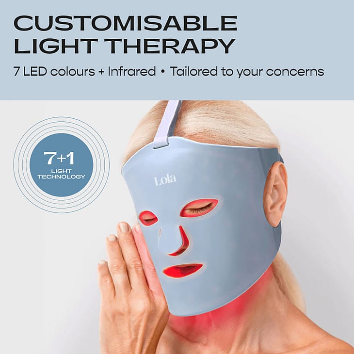 Lola Super Glow LED masken fra LOLA er udstyret med 6 lysindstillinger, der er med til at fremme kollagenproduktionen, reducerer rynker og urenheder.